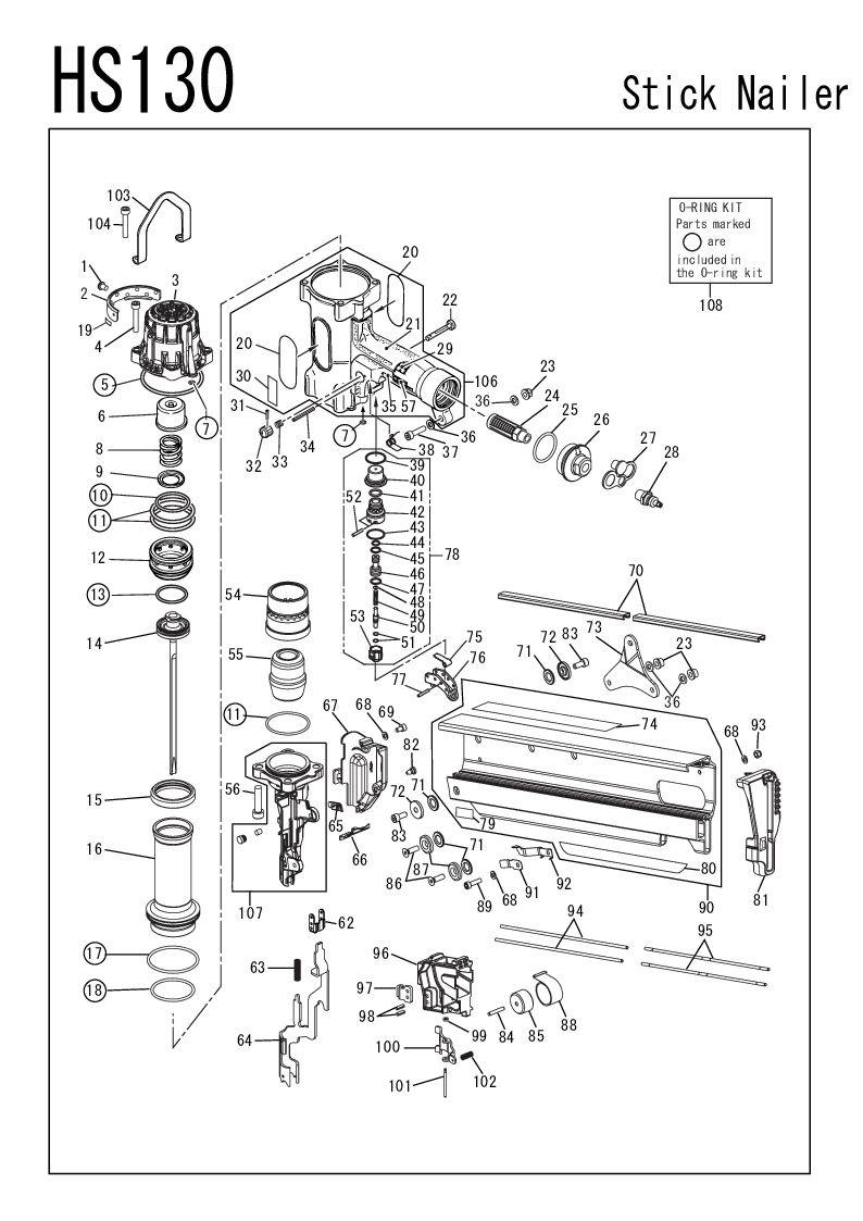 Dimensioner (L x B x H): 565 x 85 x 427 mm Vægt: 4,3 kg. Længde på søm: 90-130 mm Magasinkapacitet: 64 Diameter på søm: 3,1 - 4,2 mm Vinkel på magasin: 21° Anb. tryk under arbejde: 17-23 bar Justerbar slagdybde: Ja